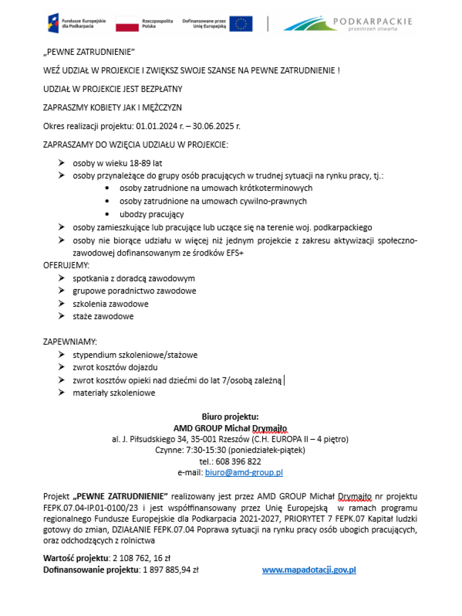 Projekt „PEWNE ZATRUDNIENIE” realizowany jest przez AMD GROUP Michał Drymajło nr projektu FEPK.07.04-IP.01-0100/23 i jest współfinansowany przez Unię Europejską w ramach programu regionalnego Fundusze Europejskie dla Podkarpacia 2021-2027, PRIORYTET 7 FEPK.07 Kapitał ludzki gotowy do zmian, DZIAŁANIE FEPK.07.04 Poprawa sytuacji na rynku pracy osób ubogich pracujących, oraz odchodzących z rolnictwa