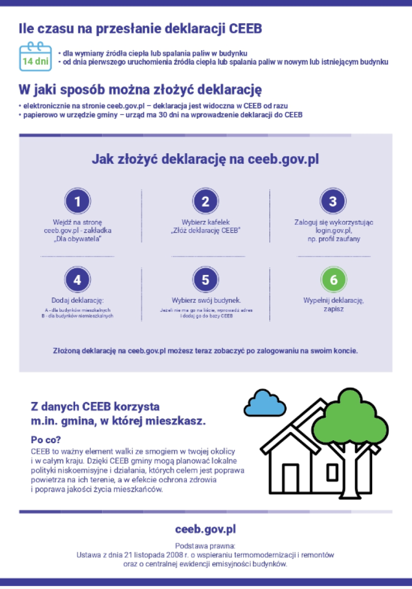 Przypominamy o obowiązku składania deklaracji do CEEB. Deklaracja jest oświadczeniem składanym przez właściciela lub zarządcę budynku/lokalu i dotyczy wszystkich – zarówno obecnych jak i nowych – źródeł ciepła i źródeł spalania paliw o mocy nominalnej do 1 MW.