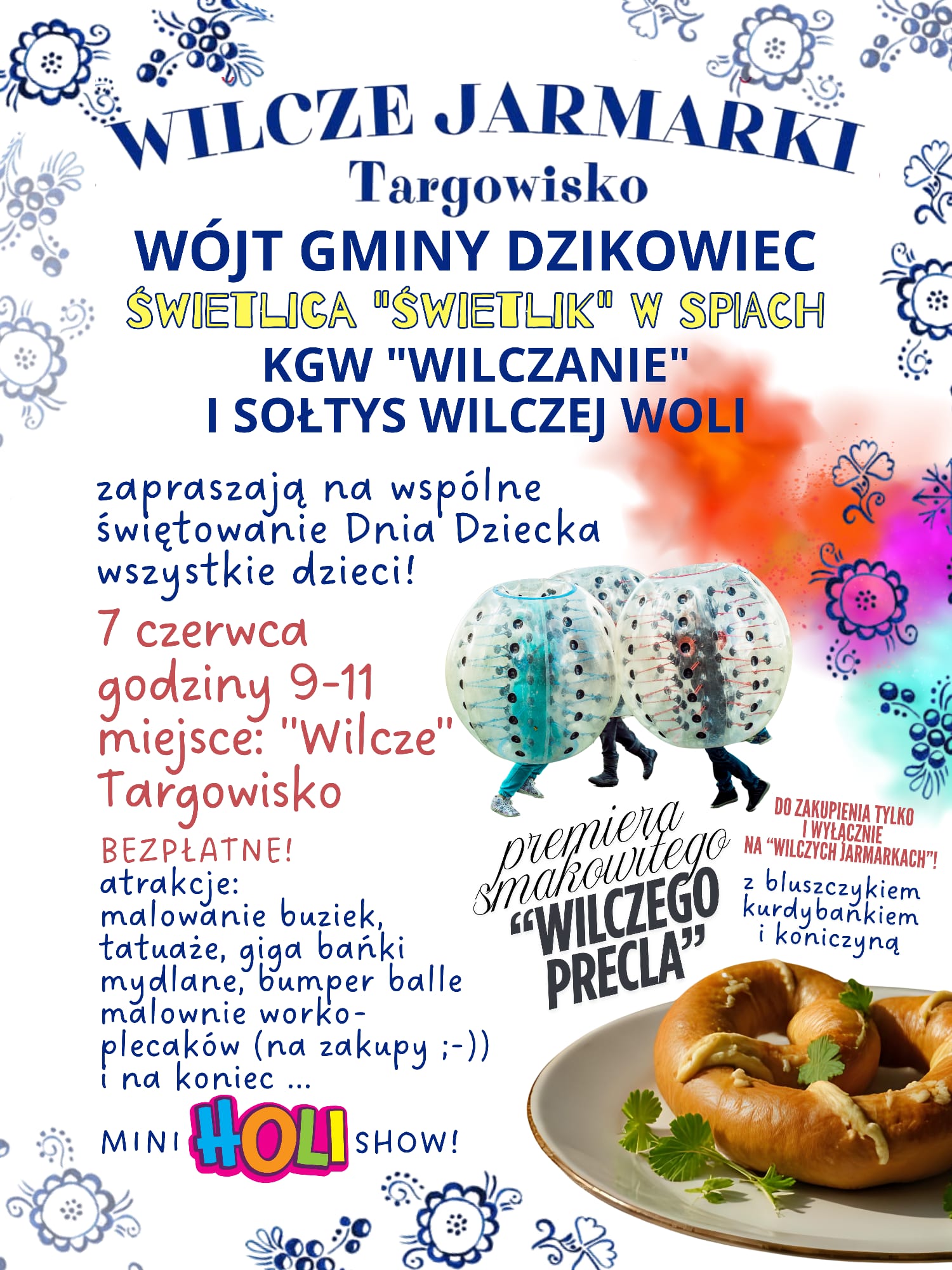 Wójt Gminy Dzikowiec, Świetlica "Świetlik" w Spiach, KGW "Wilczanie" oraz Sołtys Wilczej Woli serdecznie zapraszają na wyjątkowe obchody Dnia Dziecka, które odbędą się już 7 czerwca na Wilczym Targowisku!