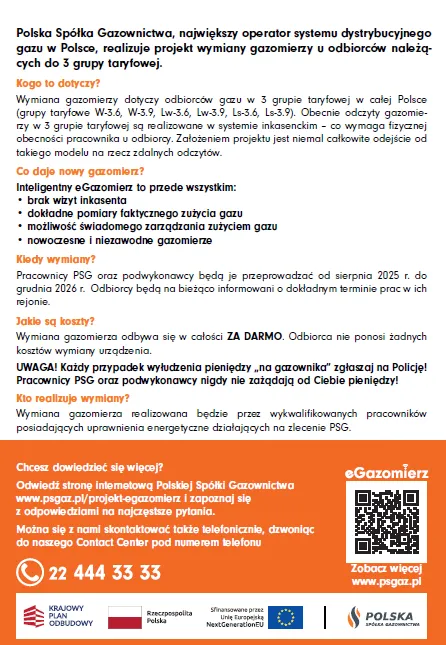 Polska Spółka Gazownictwa sp. z o.o. (PSG) rozpoczyna na terenie naszej gminy realizację innowacyjnego projektu eGazomierz. Celem tego ogólnopolskiego przedsięwzięcia jest wymiana ponad 1,38 miliona tradycyjnych gazomierzy miechowych na nowoczesne, inteligentne urządzenia z funkcją zdalnego odczytu danych.