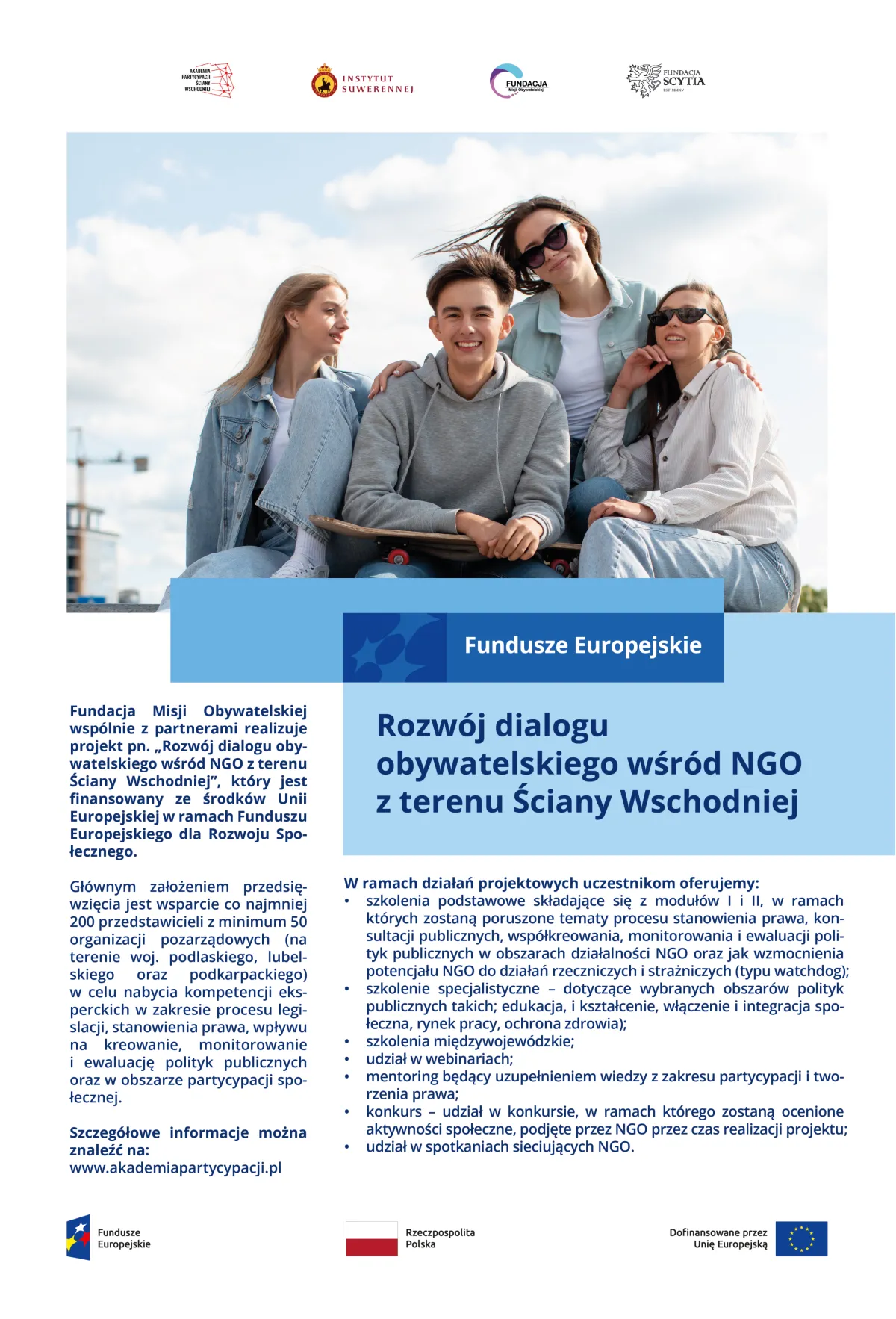 Informacje o projekcie pn. „Rozwój dialogu obywatelskiego wśród NGO z terenu ściany wschodniej” w ramach Programu Fundusze Europejskie dla Rozwoju Społecznego 2021-2027 współfinansowanego z Europejskiego Funduszu Społecznego Plus.