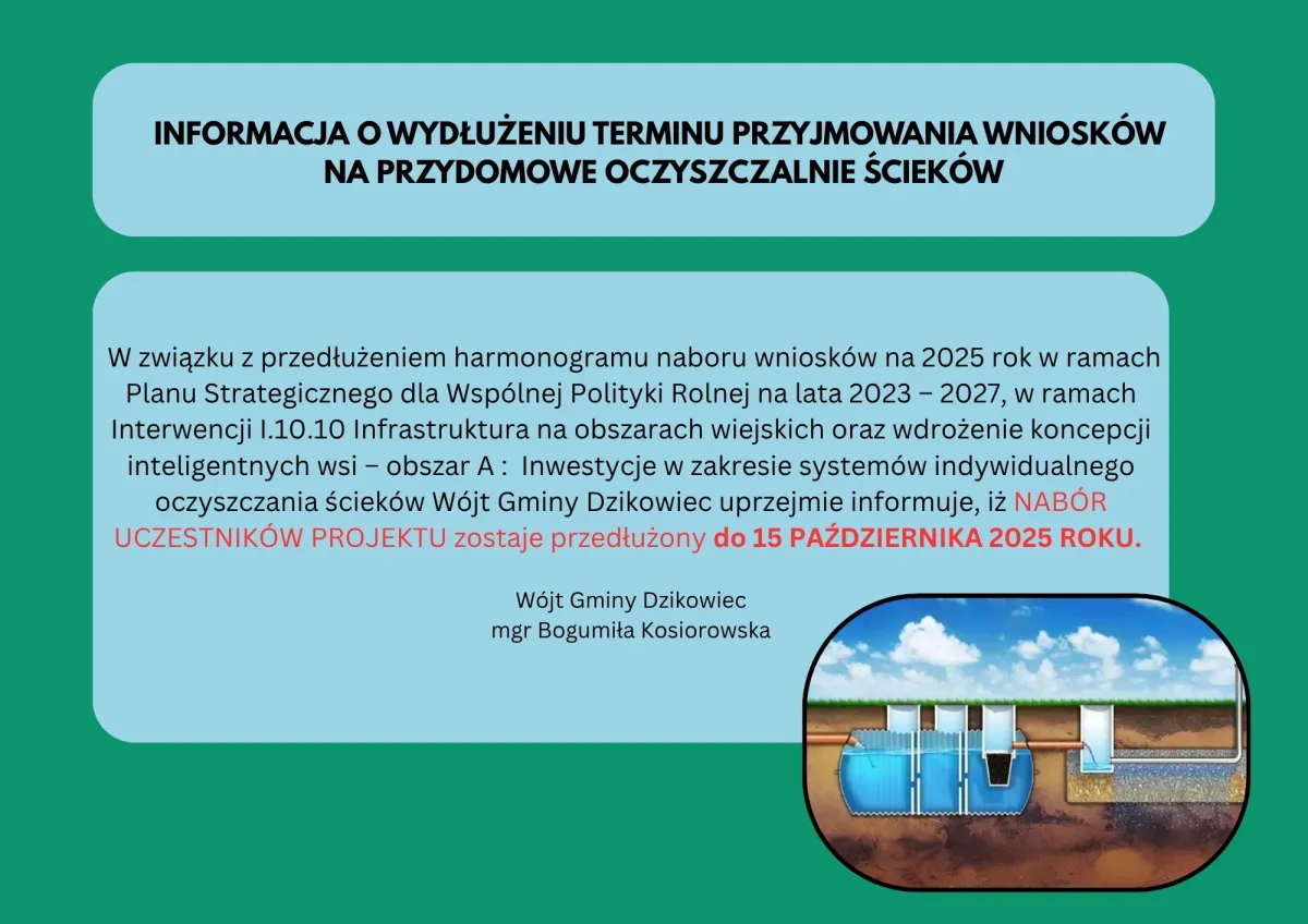 Wójt Gminy Dzikowiec informuje o wydłużeniu terminu przyjmowania wniosków na budowę przydomowych oczyszczalni ścieków. Nabór uczestników projektu, realizowanego w ramach Planu Strategicznego dla Wspólnej Polityki Rolnej, został przedłużony do 15 października 2025 roku. Decyzja ta ma związek z przesunięciem ogólnopolskiego harmonogramu naboru wniosków na 2025 rok.
