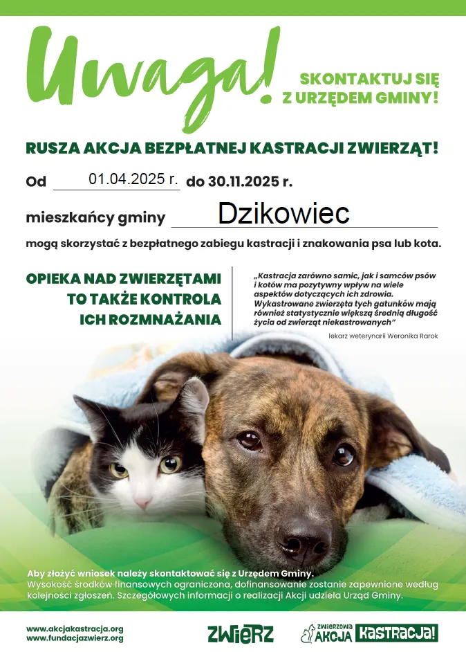 Fundacja udzieliła gminie wsparcia finansowego, realizowanego w formule „pół na pół”. Oznacza to, że gmina przeznacza 5 000 zł na wykonanie zabiegów, zaś Fundacja ZWIERZ przekazała drugą część – kolejne 5 000 zł.