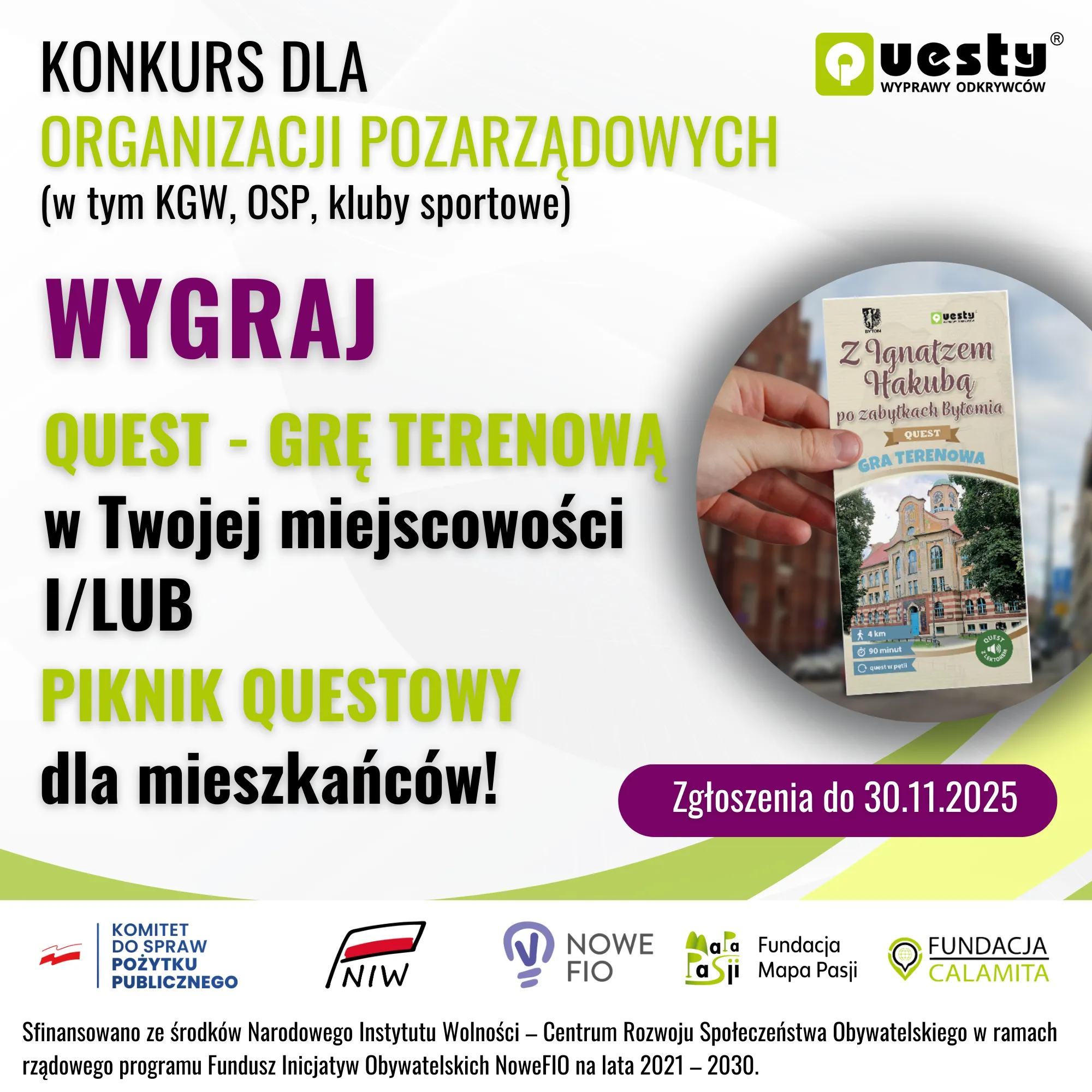 Fundacja Mapa Pasji i Fundacja Calamita, twórcy największego programu bezpłatnych krajoznawczych gier terenowych „Questy – Wyprawy Odkrywców”, zapraszają organizacje pozarządowe do wzięcia udziału w konkursie organizowanym w ramach projektu „Questy – narzędzie aktywizacji dla lokalnych organizacji”.