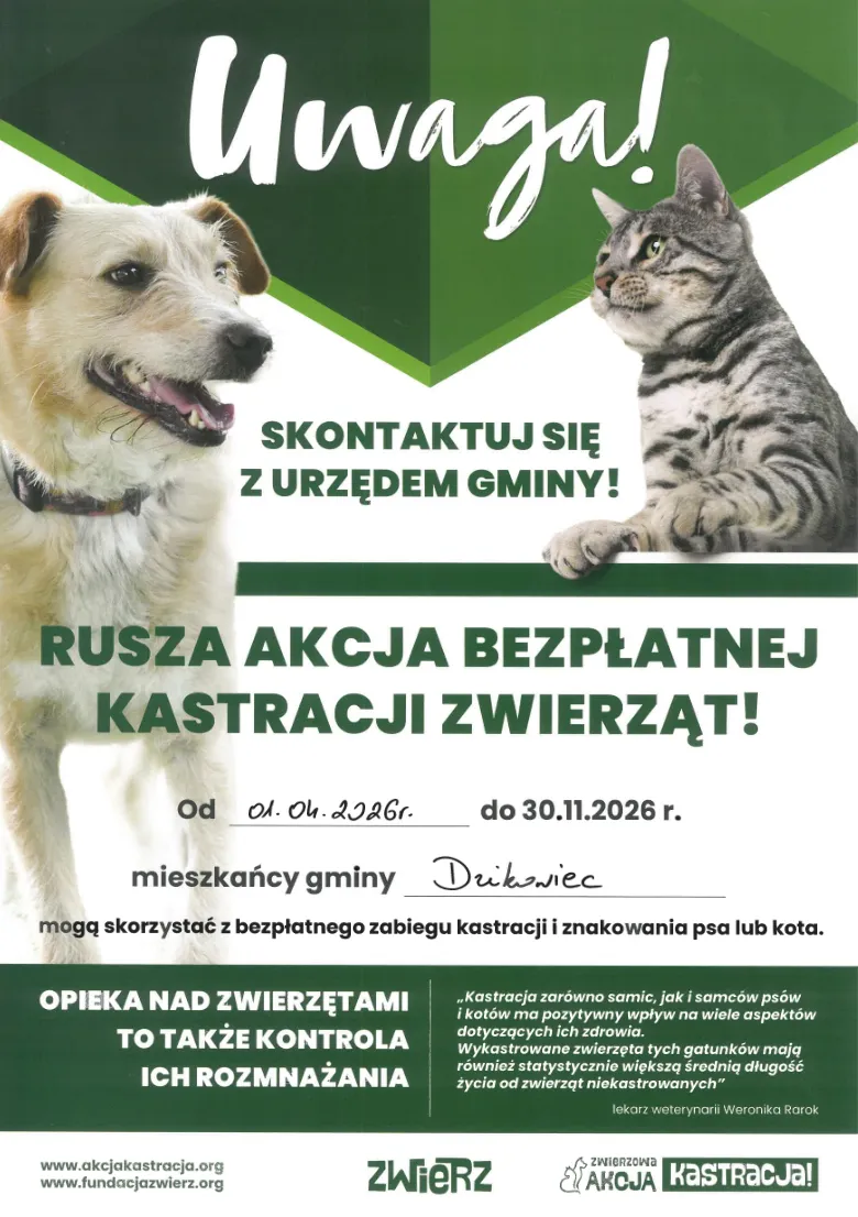 Gmina Dzikowiec zachęca mieszkańców do pełnienia roli społecznych opiekunów kotów wolno żyjących na terenie gminy, poprzez codzienne ich dokarmianie, zapewnienie stałego dostępu do czystej wody i schronienia, a także czuwanie nad stanem ich zdrowia i samopoczucia.