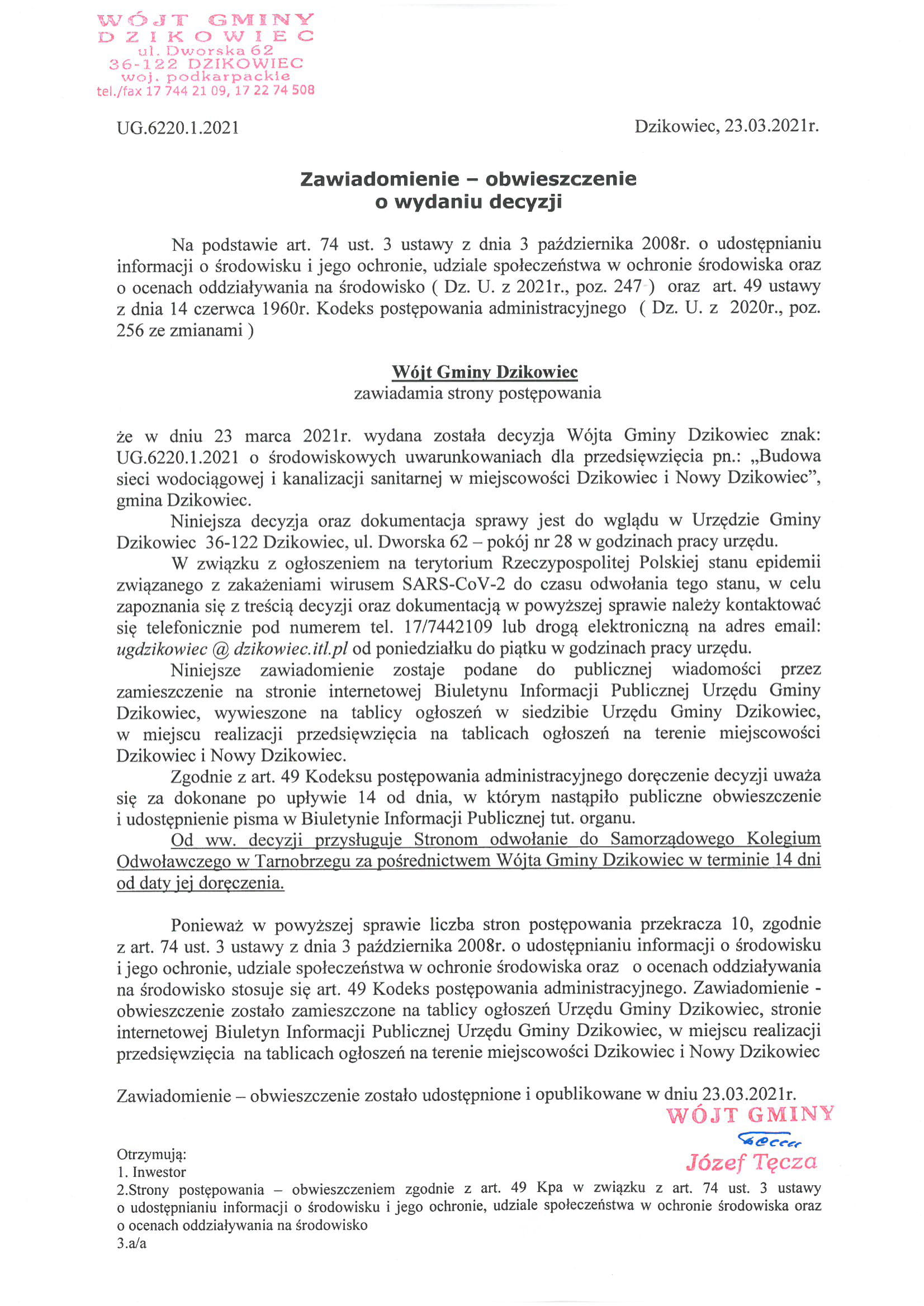 Obwieszczenie-Zawiadomienie stron postępowania o wydaniu decyzji o środowiskowych uwarunkowaniach dla przedsięwziecia pn.:"Budowa sieci wodociągowej i kanalizacji sanitarnej w miejscowości Dzikowiec i Nowy Dzikowiec"