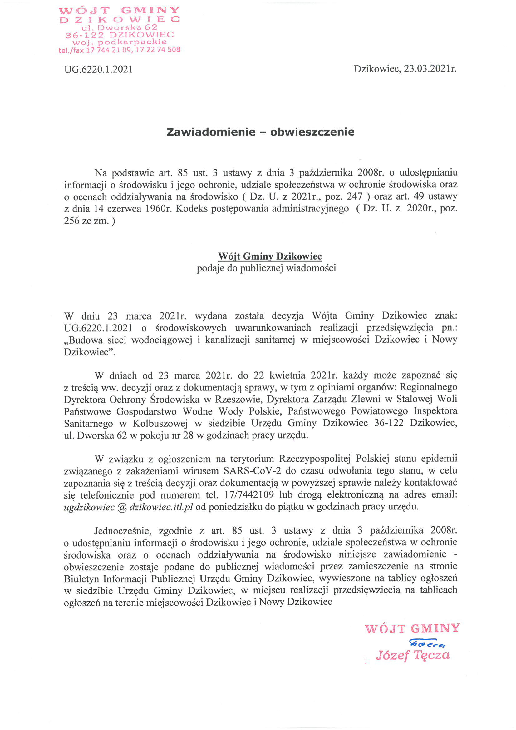 Obwieszczenie-podanie do publicznej wiadomości o wydaniu decyzji o środowiskowych uwarunkowaniach dla przedsięwziecia pn.Budowa sieci wodociągowej i kanalizacji sanitarnej w miejscowości Dzikowiec i Nowy Dzikowiec
