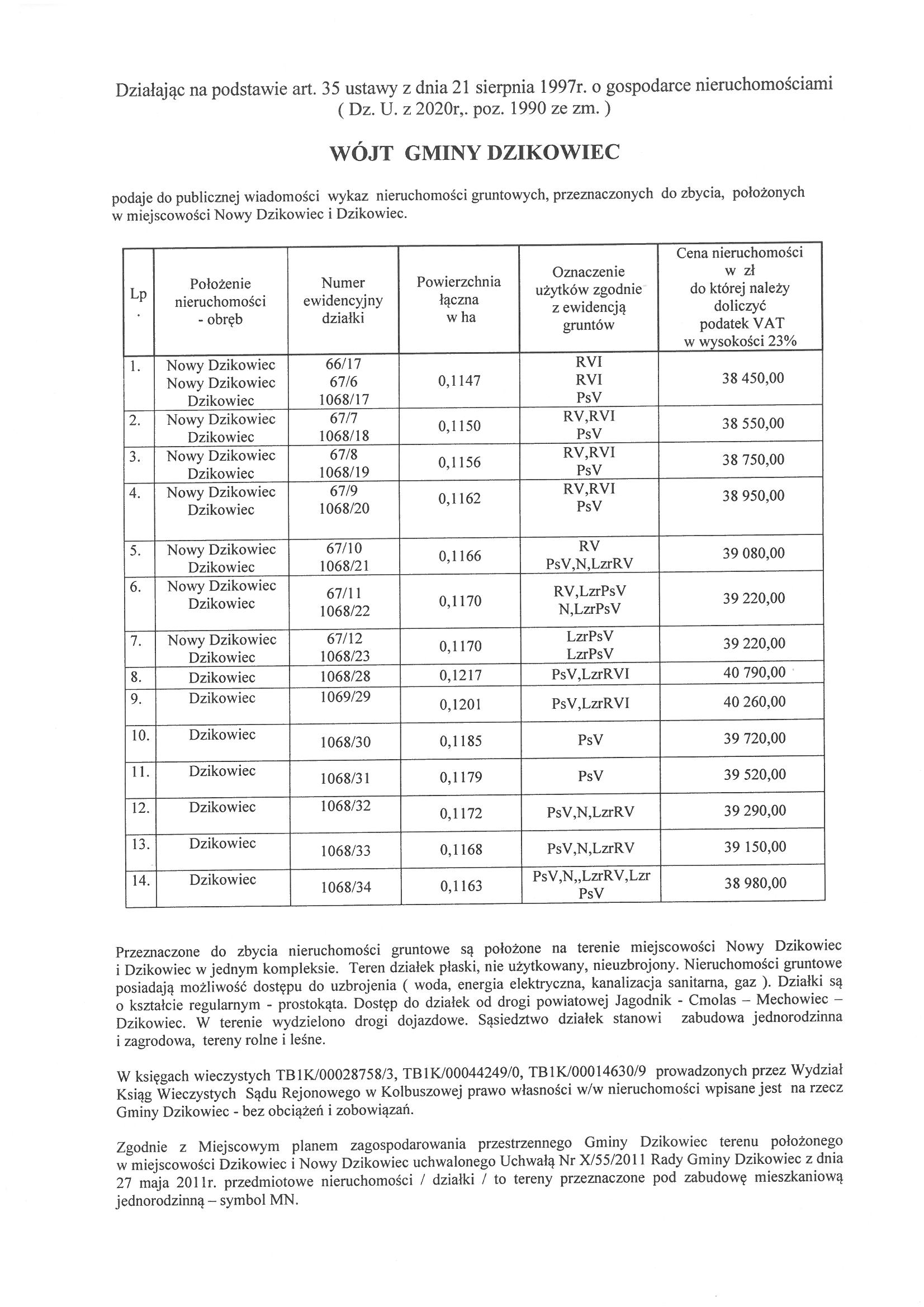 Wykaz nieruchomości gruntowych, przeznaczonych do zbycia, położonych w miejscowości Nowy Dzikowiec i Dzikowiec