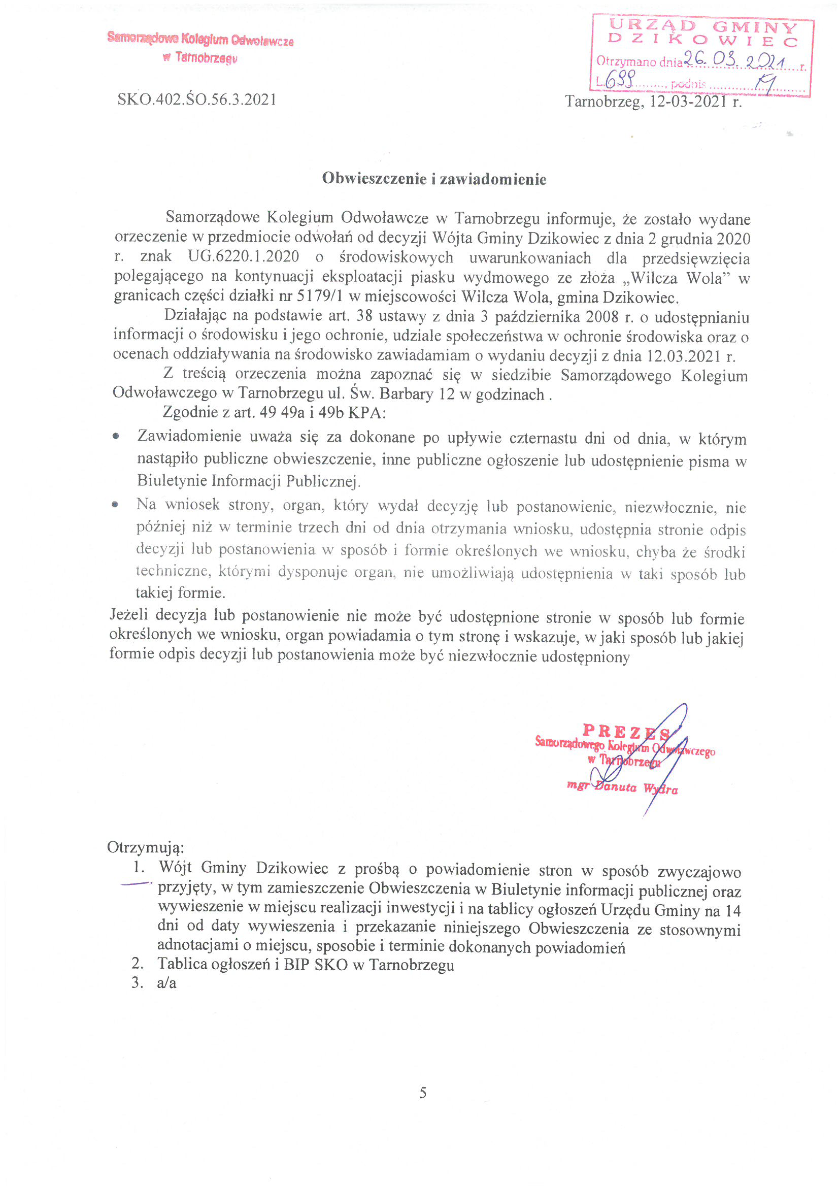 SKO.402.ŚO.56.3.2021 - Obwieszczenie i zawiadomienie Samorzadowego Kolegium Odwoławczego w Tarnobrzegu o wydaniu orzeczenia - dotyczy eksploatacji piasku wydmowego ze złoża "Wilcza Wola"
